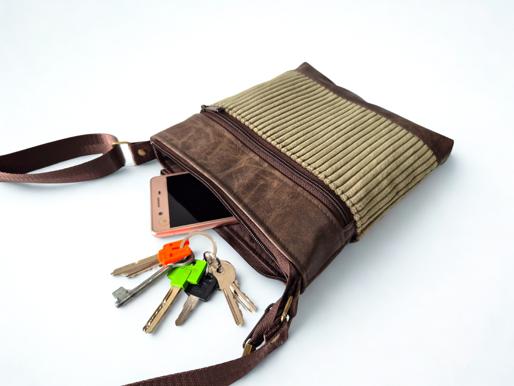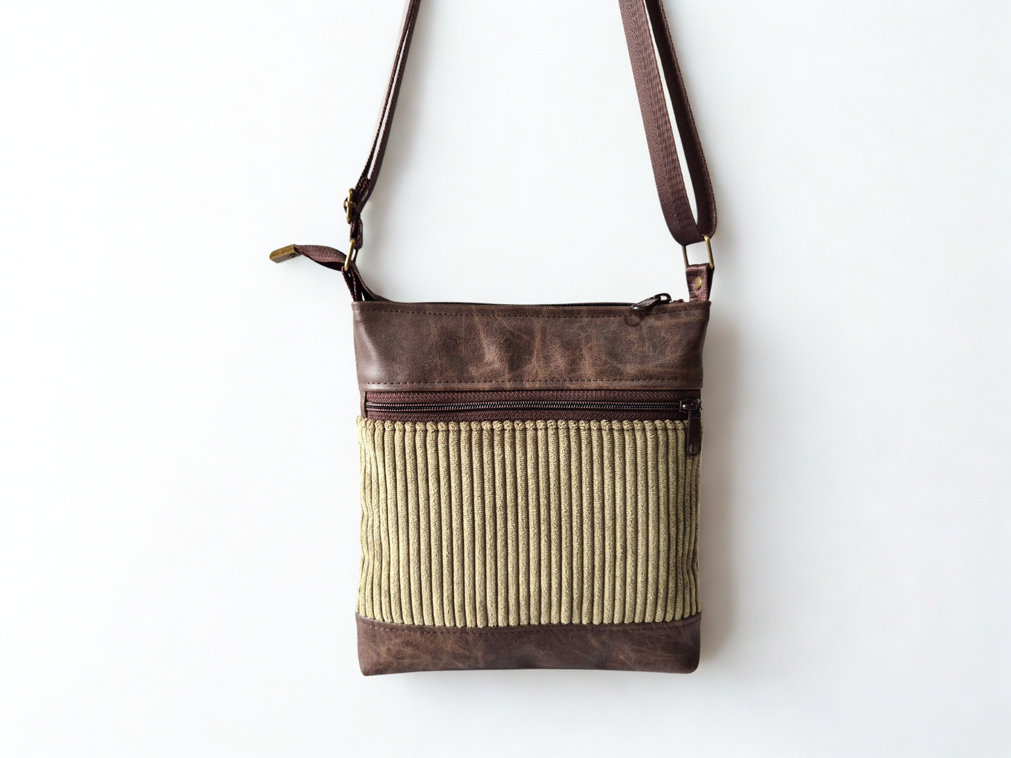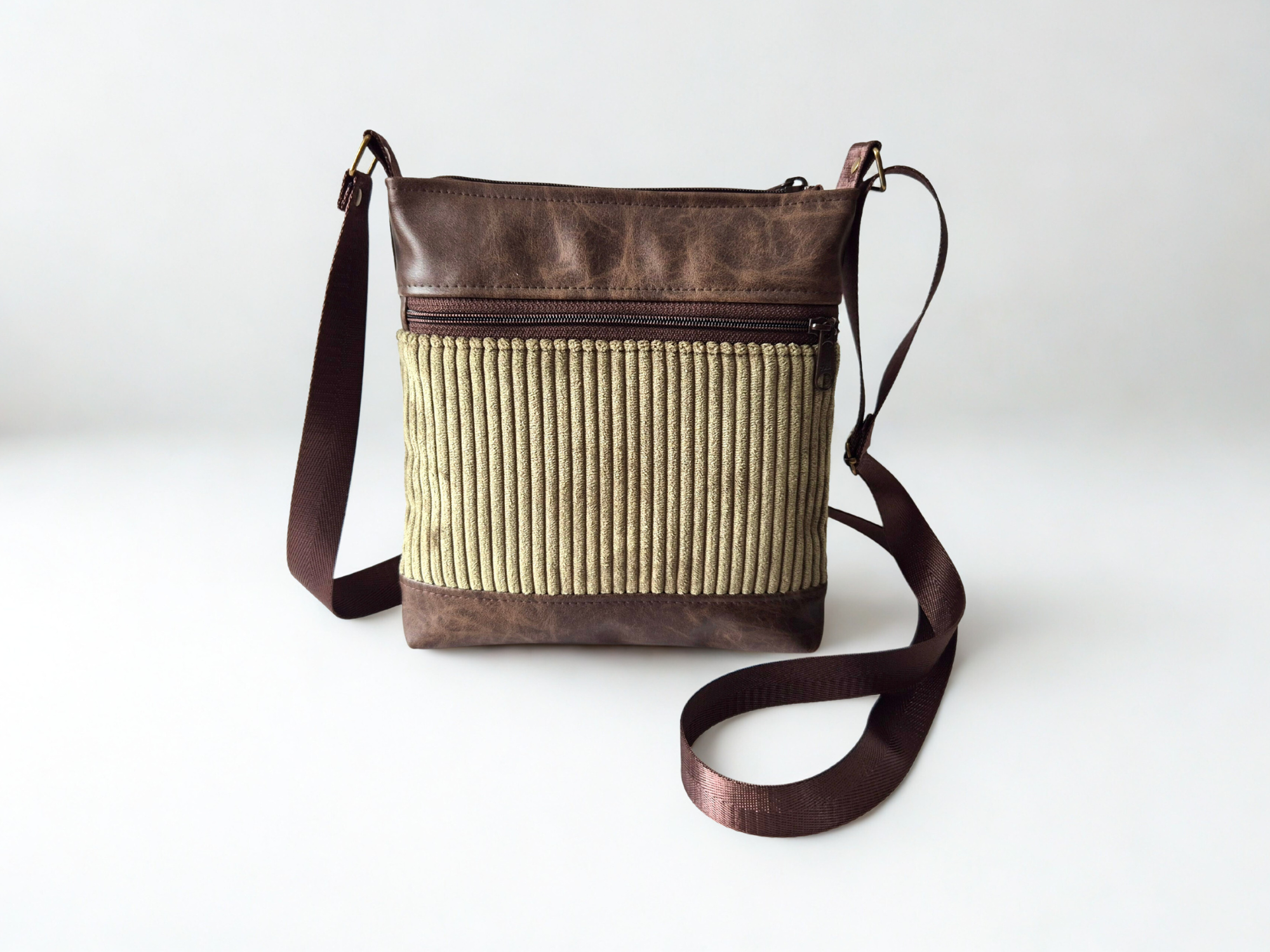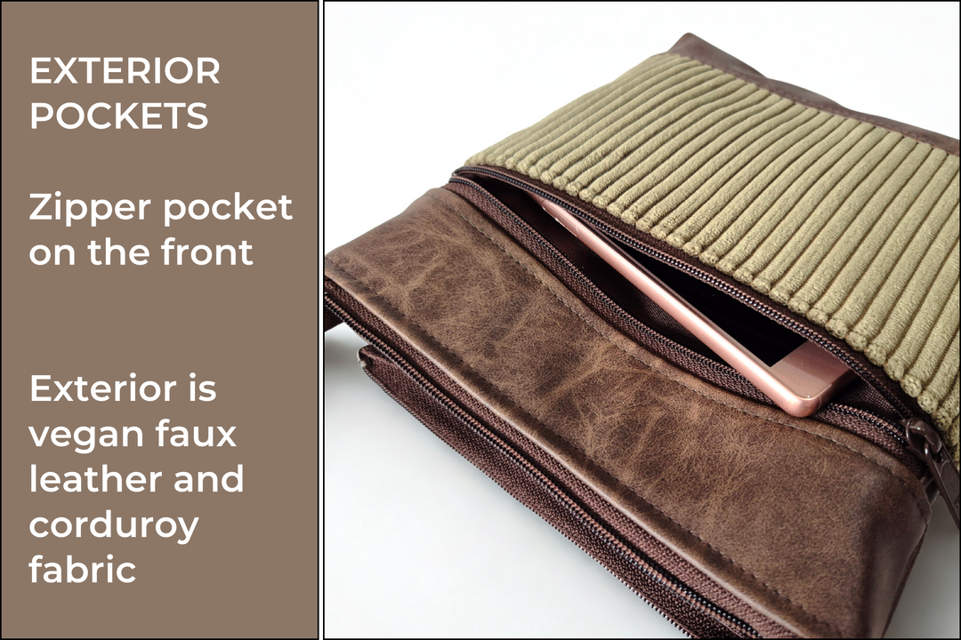 A small crossbody bag with lots of pockets to keep you organized in minimalist style. Handcrafted from a stunning olive green corduroy fabric with brown vegan friendly faux leather. Stylish, fun and fabulously functional.